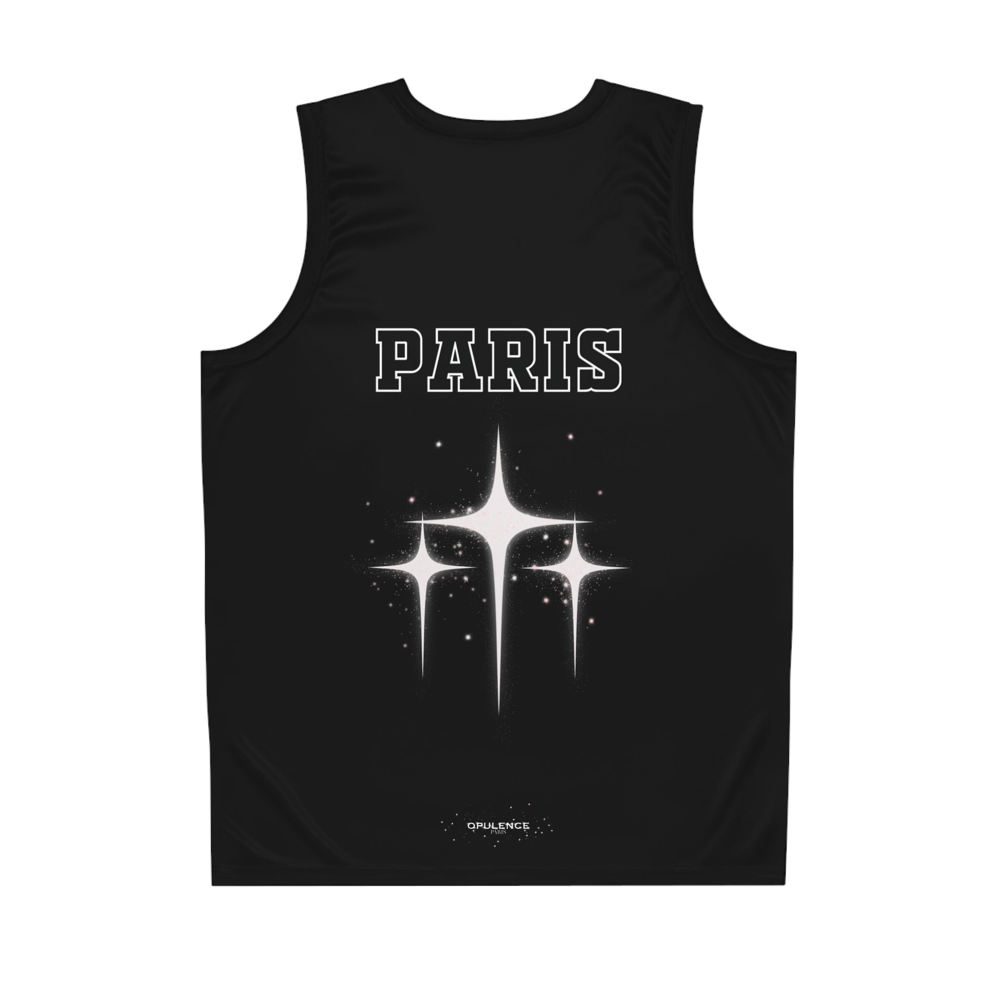 Inspired by the mystical elegance of the night sky, the "Étoile Noire" basketball jersey from the Sables d’Or et Clair de Nuit collection embodies both the boldness of street culture and the refined luxury of haute couture. Crafted in deep, pure black, it features a striking celestial theme, with shimmering stars illuminating its silhouette and creating a cosmic atmosphere along its edges. The Opulence Paris logo, prominently displayed in a classic, athletic typography, captures the harmony between high-end fashion and timeless athletic aesthetics.