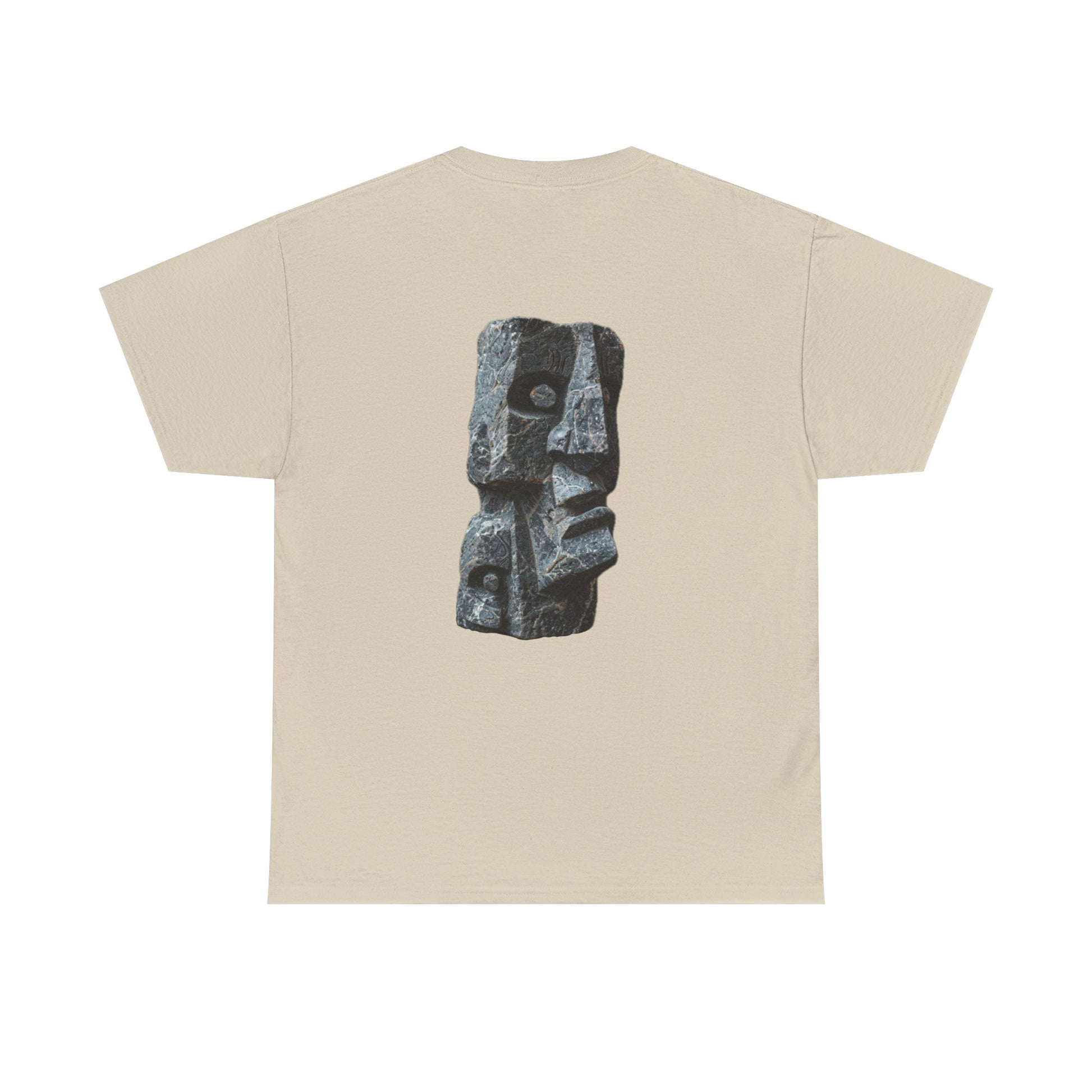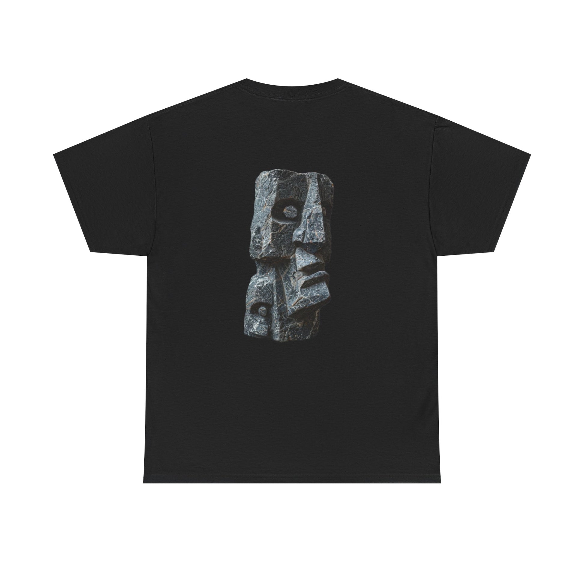 The back of the Pierre Noire T-shirt features a detailed stone sculpture rendered in a minimalist, abstract style. This artwork captures the essence of a timeless artifact—a piece of history that has weathered the sands of time yet remains unyielding in its presence. The sculpture is depicted in sharp, clean lines, evoking the rough texture and solid weight of stone, while its abstract form allows the wearer to interpret its meaning, drawing a personal connection to the ancient world.